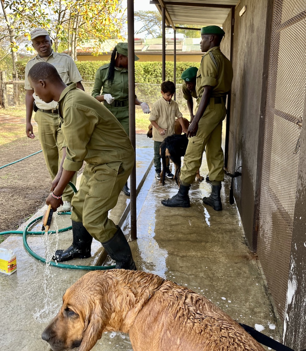Am Tag zuvor hatten wir das Canine Unit der Ranger*innen schon besucht. Meine Enkel durften die Bluthunde waschen und mit ihnen auf Spurensuche gehen. Oft sind die Ranger*innen mit ihren Hunden Wilderern auf der Spur, die immer wieder im Gebiet ihr Unwesen treiben und Tiere erlegen oder fangen.