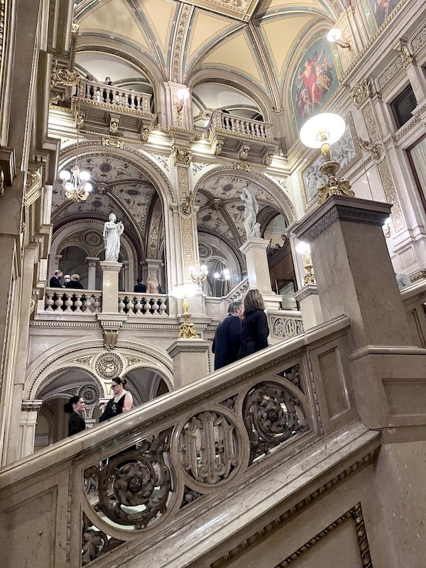Zur Pause geht’s durch die das imposante Treppenhaus ins Schwindfoyer, wo Irene unsere Erfrischung schon vorbestellt hat. Viel Zeit ist nicht und wir sind immer noch ganz berauscht von der Stimmgewaltigkeit der Sänger und Sängerinnen. Aber auch hier darf ich die Pracht und Architektur wieder bewundern. Noch schnell ein Bild und da läutet auch schon die Glocke.