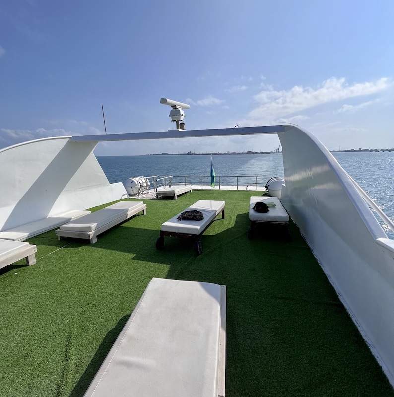 Nach zwei Tagen in Dschibuti ist es endlich so weit. Wir schippern zu der im Hafen ankernden M/Y Lucy, unserem Tauchschiff (zur Erklärung: M/Y steht für Motor Yacht).