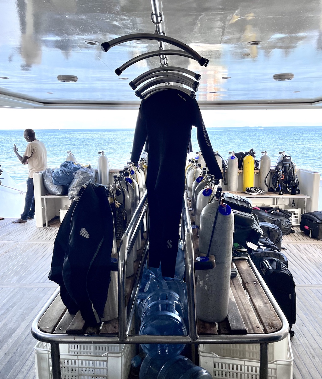 Ein Tag auf einem Tauchschiff beginnt früh! Wecken um 5:30 Uhr, mit einem Tee oder Kaffee. Dann das Briefing für den ersten Tauchgang um 6:00 Uhr. Wohlgemerkt noch vor dem Frühstück. Nach dem Frühstück heißt es neue Flaschen montieren, ein bisschen chillen und um 11:00 Uhr wieder ins Wasser. Danach gibt es ein reichliches Mittagessen mit frischem Fisch, diversen Salaten und Gemüse. Der Nachtisch ist meistens Obst. Um 15:00 Uhr kommt der dritte Tauchgang des Tages, und für die ganz sportlichen noch ein Nachttauchgang um 18:00 Uhr. Langweilig wird es auf dem Boot garantiert nicht 😉