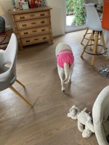 Den richtigen Riecher hatte aber bereits ein Nachbarsrüde, der schon eine Woche zuvor hinter Lotta her war wie ein „Verrückter“ (so sagte Frauchen selbst :-). Ich war wirklich ahnungslos, putze das Parkett nun täglich mehrfach und wenn es gar nicht anders geht, muss Lotta in das pinkfarbene Teil schlüpfen. Was wir ihr aber gern ersparen.