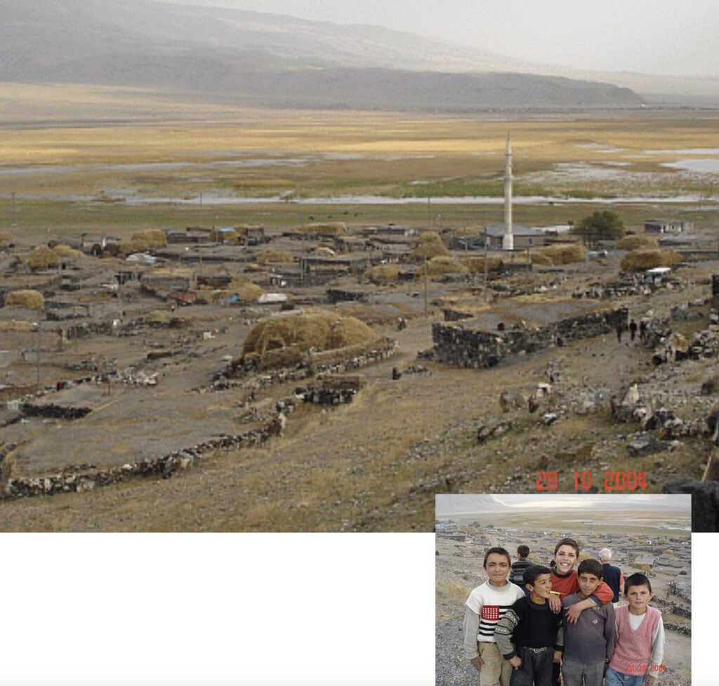 Er zeigt sich unverändert wolkenumhüllt, so dass wir schließlich umkehren (die Straße führt übrigens nach Armenien, dessen Hauptstadt Eriwan nicht allzu weit entfernt liegt) und machen an einem eigenartigen Dorf Halt, das in einer tiefen, langgezogenen Mulde unterhalb der Autostraße liegt. Ein seltsames Ensemble aus grasbewachsenen Steinmauern, die den Wind abhalten und das Eigentum markieren. Dazwischen strohgedeckte Hütten aus Lehm und Stein, geduckte Behausungen, an die sich riesige Strohballen, größer als die Hütten selbst, anschließen. Überall hängt Wäsche, aus primitiven Ofenrohren steigt Qualm empor, und es riecht verbrannt. Dazwischen allerlei Getier in den schmalen Gassen, viele Kinder, die beim Anblick unseres Busses den Hügel hinaufgestürmt kommen und sich lebhaft um uns scharen. Kein Wunder, dass unsere Kugelschreiber-Vorräte rasant abnehmen. Derartige Dörfer sehen wir heute erneut, diesmal mit jurte-ähnlichen Zelten.