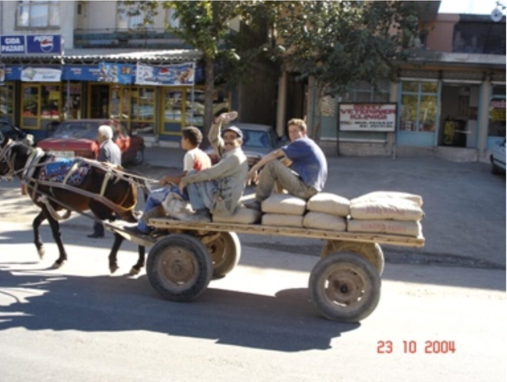 Natürlich bringt eine solche Reise auch immer etwas Unerwartetes: als wir an einer Tankstelle auf eine freie Zapfsäule warten, stürmen plötzlich ein Dutzend Kühe über das Gelände, ehe sie ihren Weg auf der Autostraße (!) fortsetzen. Auf der Weiterfahrt begegnen uns immer wieder Pferde- und Eselskarren, gesteuert von alten Männern mit kernig-zerfurchten Gesichtern und interessanten Kopfbedeckungen. Die Tiere quälen sich die bergige Straße empor, umso mehr, als die Lastkarren grotesk überladen sind: Hausrat, Gemüse, Obst, technisches Gerümpel – alles, was die Phantasie zu bieten hat.