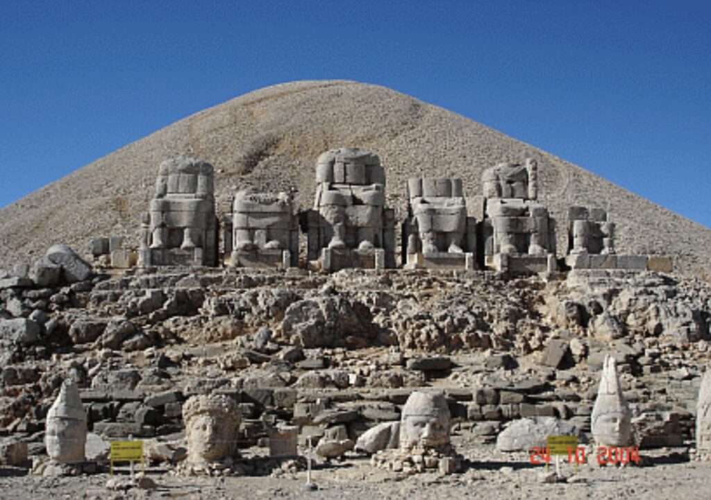 Die restlichen 11 km bis zum Nemrut Dagi haben es in sich: die „Straße“ geht steil nach oben und ist in einem schlimmen Zustand: Löcher, Verwerfungen, spitze Steine, selten ein anderes Fahrzeug, so gut wie kein Tourismus. Endlich erreichen wir das weltberühmte Ziel und stellen unseren Bus auf die einzig ebene Fläche weit und breit: die Polizeistation, von der aus man einen fabelhaften Rundblick (u.a. auf das riesige Staudamm-Projekt) hat. Unsere Höhe beträgt 2150 m. Nun steigen wir bei bestem Wetter hinauf zum Gipfelplateau des Berges, wo König Antiochus I., Herrscher des Kleinstaates Kommagene (1. Jh. v. Chr.), eine riesige Kultstätte errichten ließ. Sie umfasst (als 8. Weltwunder) den Grabtumulus des Königs sowie Kolossalstatuen von Tier- und Menschengöttern, alle überlebensgroß und trotz der Einwirkungen von Naturgewalten recht gut erhalten.