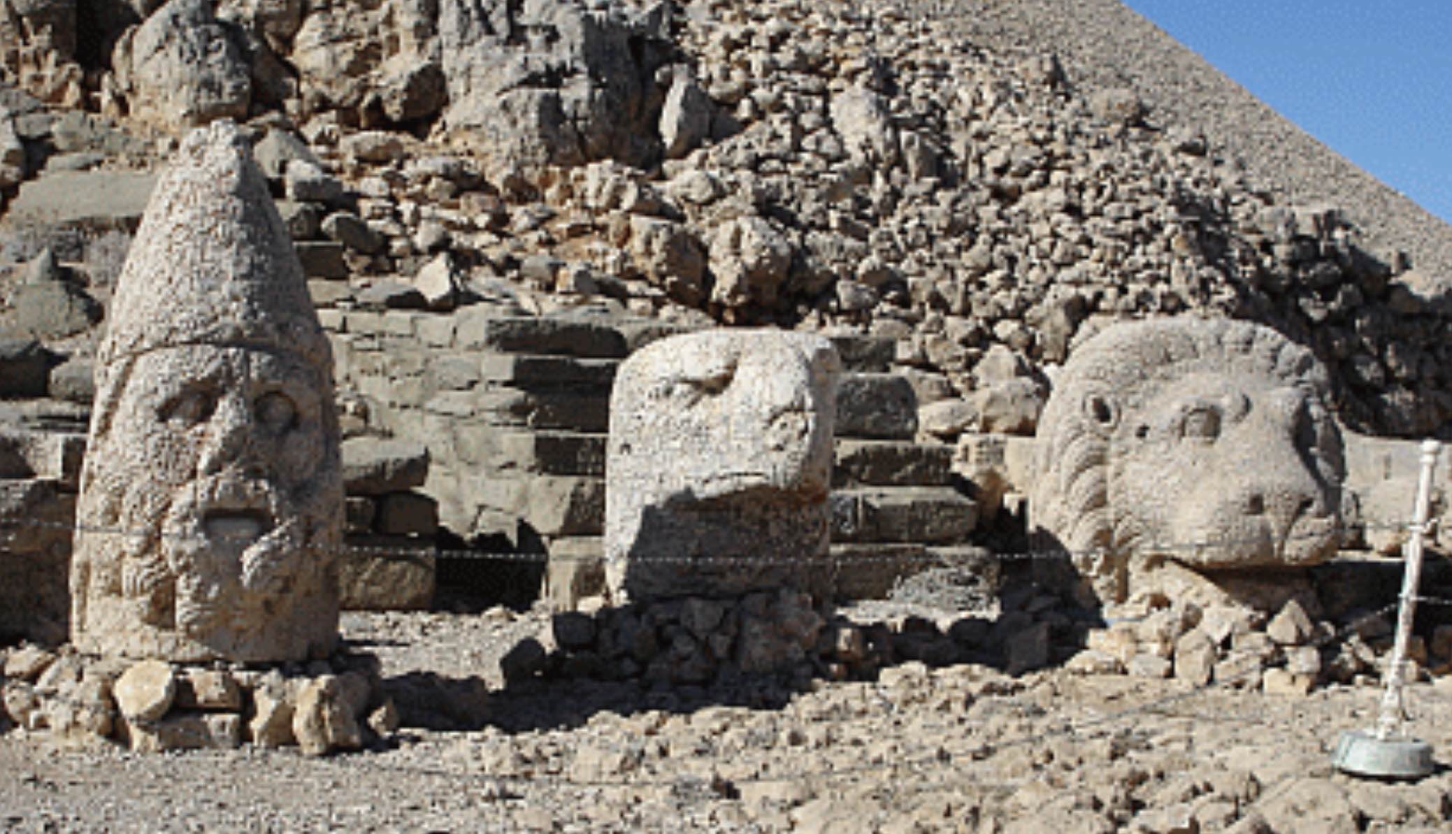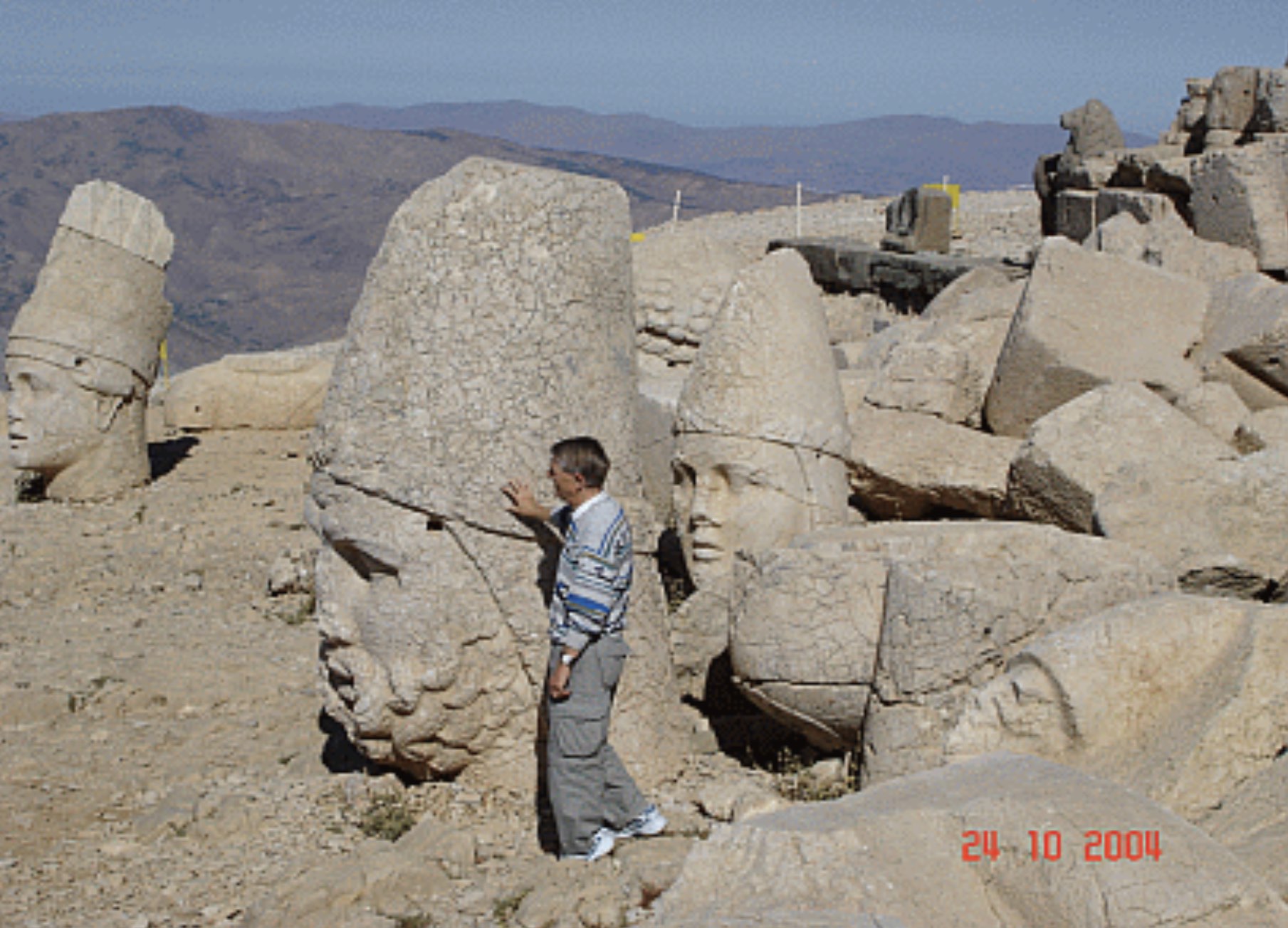 Die restlichen 11 km bis zum Nemrut Dagi haben es in sich: die „Straße“ geht steil nach oben und ist in einem schlimmen Zustand: Löcher, Verwerfungen, spitze Steine, selten ein anderes Fahrzeug, so gut wie kein Tourismus. Endlich erreichen wir das weltberühmte Ziel und stellen unseren Bus auf die einzig ebene Fläche weit und breit: die Polizeistation, von der aus man einen fabelhaften Rundblick (u.a. auf das riesige Staudamm-Projekt) hat. Unsere Höhe beträgt 2150 m. Nun steigen wir bei bestem Wetter hinauf zum Gipfelplateau des Berges, wo König Antiochus I., Herrscher des Kleinstaates Kommagene (1. Jh. v. Chr.), eine riesige Kultstätte errichten ließ. Sie umfasst (als 8. Weltwunder) den Grabtumulus des Königs sowie Kolossalstatuen von Tier- und Menschengöttern, alle überlebensgroß und trotz der Einwirkungen von Naturgewalten recht gut erhalten.