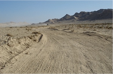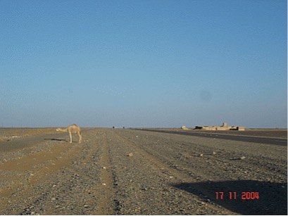 Seit Tagen ist das Wüstenpanorama für uns keineswegs monoton, sondern – wenn man erst einmal den Blick dafür entwickelt hat – äußerst abwechslungsreich in Formen und Farben. An einer Stelle will es der Zufall, dass das Auge in einem Winkel von 180° erst kahle, schroffe Berge, dann die schnurgerade, in den Himmel führende Autostraße, dann einige versprengte Lehmhütten von wüstentauglichen Belutschen (zerfurchte Gesichter mit Räuberbärten) und schließlich, jenseits des grauen Geröllteppichs, die endlose Weite des gelben Wüstensandes einfängt – wie ein extremes Weitwinkelobjektiv.