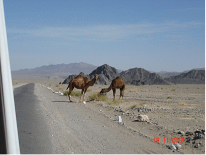 Sie ist teilweise sehr schlecht (scharfe Ränder, Schlaglöcher), so dass jeder Gegenverkehr (der zum Glück recht spärlich ist) mit einer Mischung aus Selbstbewusstsein und Fingerspitzengefühl bewältigt werden muss: in der Hierarchie kommen die Busse zuerst, dann die prächtig dekorierten Lastwagen, dann wir und schließlich Motorräder sowie – für uns sehr überraschend – die zahlreichen Radfahrer, die mit flatternden Kittelhemden und der landestypischen Kappe durch die Wüste gondeln. So ist sogar auf der Fernstraße zwischen dem Iran und Pakistan der Drahtesel neben dem Esel ein verbreitetes Fortbewegungsmittel.