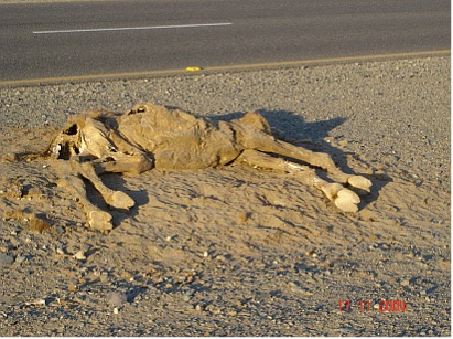 Auch einige ihrer Kadaver liegen links und rechts am Wegesrand. Der Verkehr ist extrem spärlich, und nur ab und zu begegnet ein bunt geschmückter Lkw von der Sorte, die auch in ganz Südostasien (Indien, Thailand) bekannt ist. In großen Abständen bemerken wir aufgelassene Karawansereien, vor denen die Bewohner große Mengen von (geschmuggeltem) Treibstoff aus dem Iran in Fässern gestapelt haben. Bisweilen engen Sandverwehungen die ohnehin schmale Autopiste noch weiter ein, die wir übrigens ab jetzt auf der linken Seite befahren müssen (wo uns eine Eisenbahnlinie permanent begleitet).