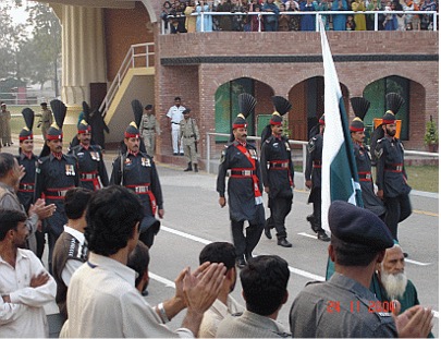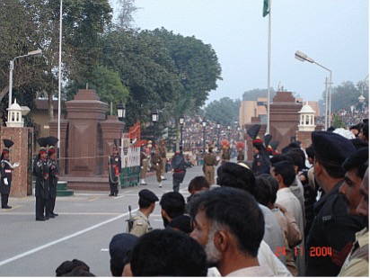 Höhepunkt des Abends ist ein indisch-pakistanisches Flaggenzeremoniell, in dessen Verlauf sich die Grenzsoldaten beider Seiten, angefeuert von einer aufgepeitschten Menge diesseits und jenseits der Demarkationslinie, auf allerengster Tuchfühlung gegenüberstehen. Nur durch wenige Zentimeter getrennt, holen prächtig uniformierte Wachsoldaten mit viel Pomp und eindrucksvoller Mimik (stolze Brust, martialische Kommandos) ihre jeweilige Landesfahne ein – und das jeden Tag! So lassen beide Länder symbolisch die Muskeln spielen, ein Unterhaltungsritual, das vor dem Hintergrund dieser hochsensiblen Grenze und den Spannungen der Vergangenheit (seit 1947 gab es drei indisch-pakistanische Kriege) eher friedlich als aggressiv wirkt. Kurz nachdem sich die große Zuschauermenge auf der pakistanischen Seite verlaufen hat, kommt ein Bus durch das ausnahmsweise geöffnete Grenztor mit der Aufschrift LAHORE – DELHI und den gekreuzten Flaggen beider Länder.