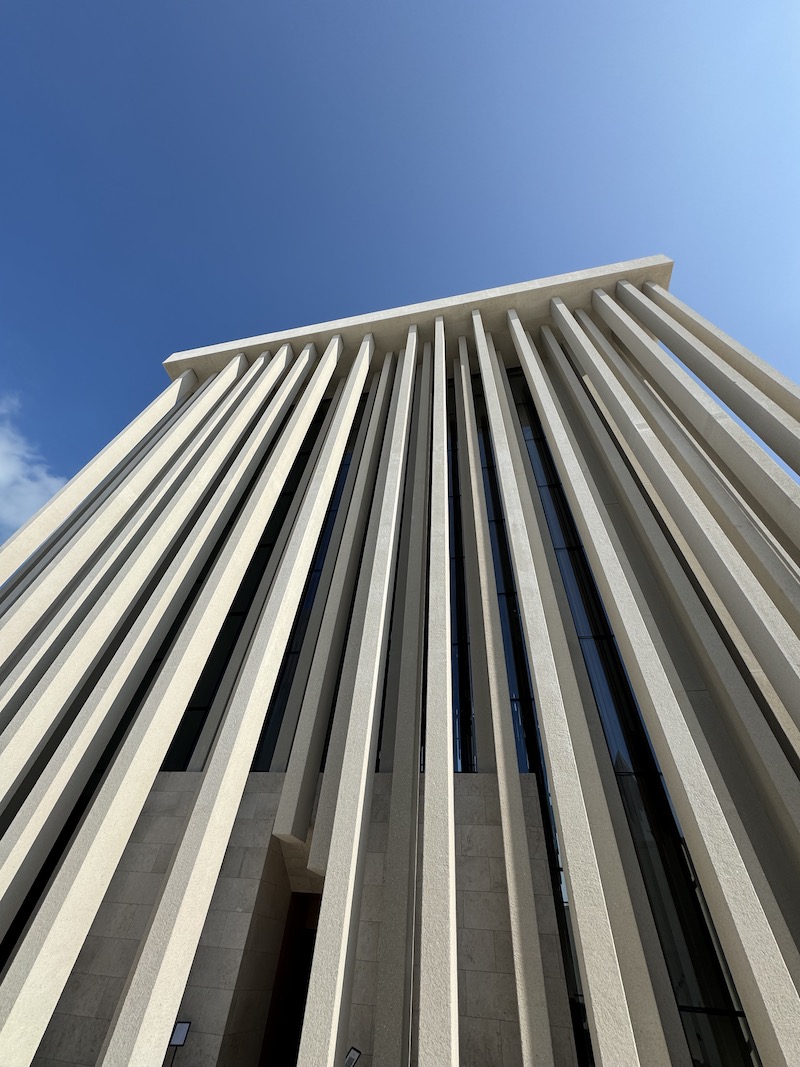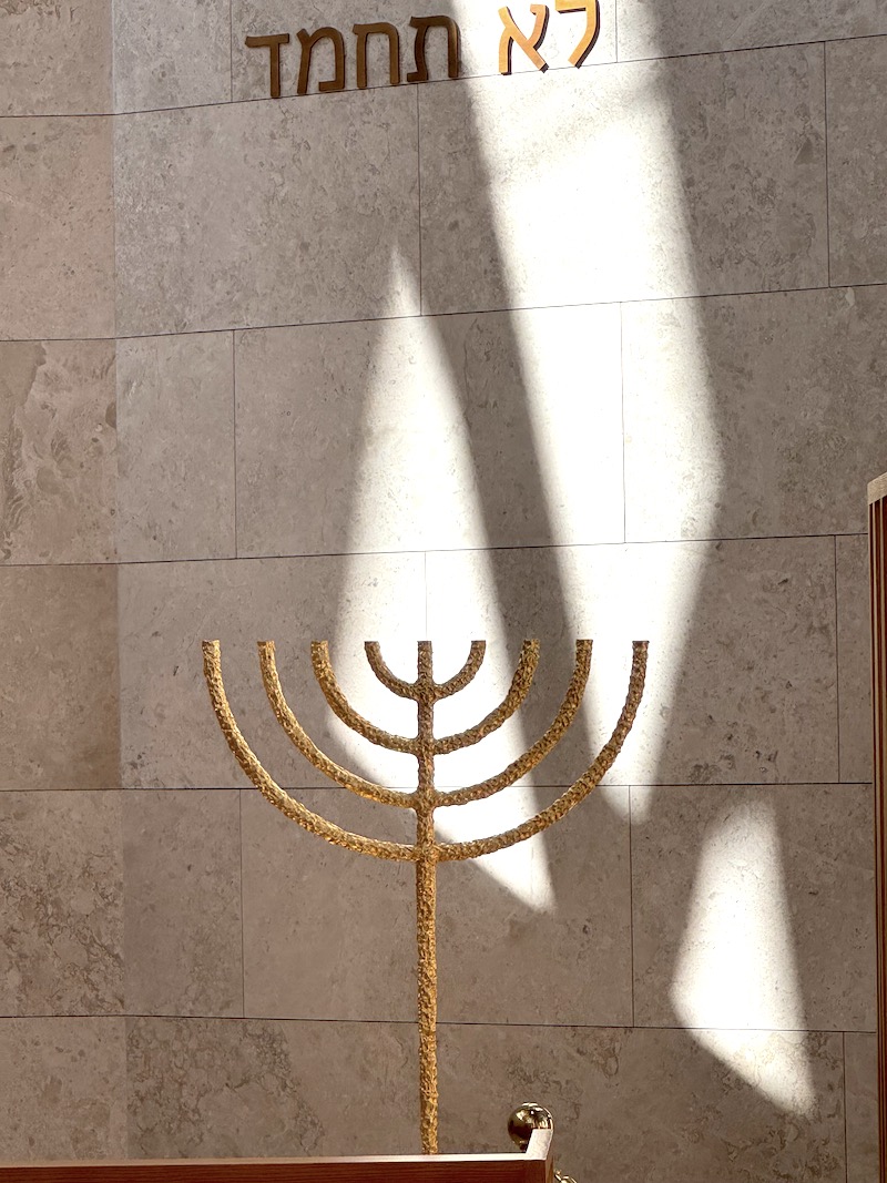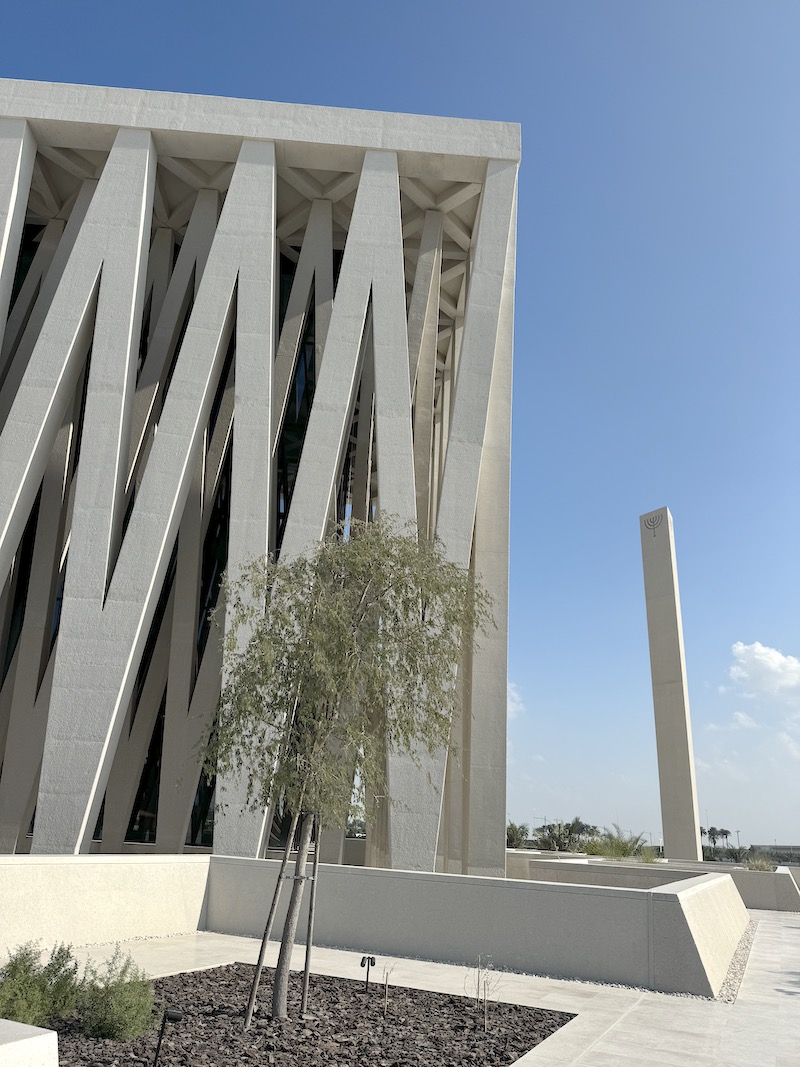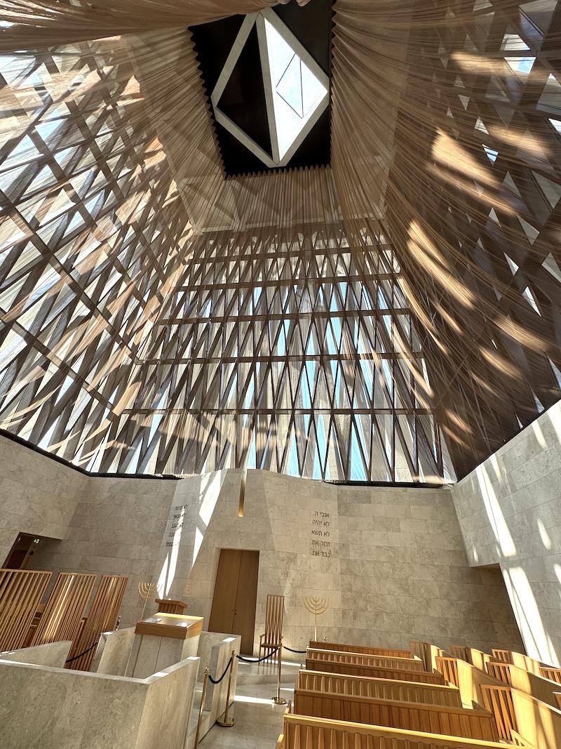 Die Synagoge symbolisiert einen traditionellen Gebetsort der Juden. Die kreuz und quer verlaufende Diagrid-Fassade stellen Palmen dar, die zum Bau einer Laubhütte (Sukkah) verwendet wurden, die, während dem Fest der Zuflucht, als Unterschlupf dient. Die Sukkah bietet Schutz vor der Sonne und ermöglicht die Sicht auf die Sterne in der Nacht.