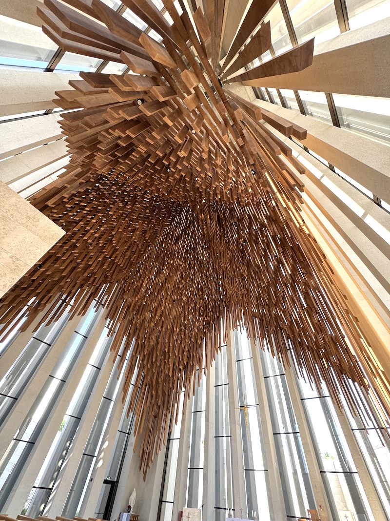 Die Holzlatten im Dachgewölbe sind von Lichtstrahlen inspiriert und erinnern an den Altar im Petersdom in Rom. Mehr als 13.000 Laufmeter Holz bilden das Gewölbe der Kirche.