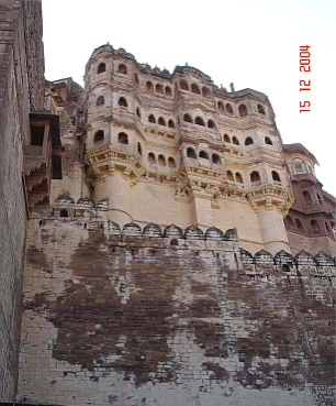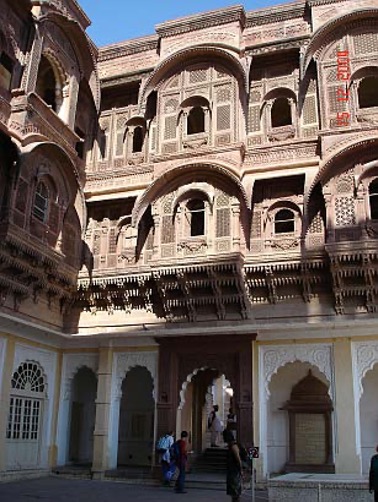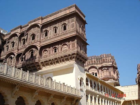Die Festung von Jodhpur heißt Meherangarh, ist im Besitz des Maharadschas von Jodhpur und steht auf einem 125-m-hohen Hügel. 1459 erbaut ist sie niemals militärisch eingenommen worden. Das erste Tor ist noch immer durch Kanonenkugeln verunstaltet. Um zu verhindern, dass Kriegs-Elefanten als Rammböcke benutzt werden, liegen die Tore im kurzen rechten Winkel zur Einfallstraße und sind außerdem an ihren Stirnseiten mit spitzen Eisendornen versehen. An einem anderen Tor finden sich 15 Handflächenabdrucke als Hinweis darauf, dass sich einige Witwen des Maharadschas Man Singh in den damals üblichen Verbrennungstod (Sati) stürzten, als sein Leichnam 1843 eingeäschert wurde. Innerhalb des Forts gibt es eine Reihe von Innenhöfen und Palästen. Die Zimmerfluchten des Palastes tragen beziehungsreiche Namen: Sukh Mahal (Freudenpalast) und Phrol Mahal (Blumenpalast). In ihnen befindet sich eine Sammlung von Gegenständen aus dem täglichen Leben eines indischen Königshauses und eine Sammlung prunkvoller Elefantensattel, Frauen- Sänften (Palenquins), Waffen, Möbel und Kinderwiegen. Der Blick von den äußeren Zinnen auf die „blaue Stadt“ ist großartig. Übrigens bezeichnet blau (Indigo) traditionell das Heim eines Brahmanen. Außerdem hilft die Farbe bei der Mückenabwehr.