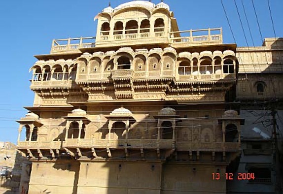 Wir fahren 6 Stunden lang durch Halbwüste, grün-gelbe Rapsfelder, ausgedehnte Bewässerungsanlagen, kleine Siedlungen mit runden Hütten und Ziegenherden – dann wieder Wüste, soweit das Auge schaut, bis wir in Jaisalmer ankommen, einer Stadt, die von einer Festung überragt wird, die durch 99 Bastionen gesichert ist. Der frühere Wohlstand der Stadt zeigt sich, wie anderswo, in den berühmten Wohnhäusern der reichen Großfamilien, den havelis. Die Reichen machten aus ihren Häusern eine befestigte Residenz, die mit Säulen, Balkonen, Fenstern, Arkaden, Alkoven, Nischen und Wandmalereien verziert wurde. Häufig liegen die Terrassen und vorspringenden Balkone vor Säulengängen, die eingefasst sind von durchbrochenen Steinblenden. Sie halten die Sonne ab, lassen aber den kühlenden Wind hindurch. Um diese Wirkung zu verstärken, wurden früher feuchte Matten und duftende Wurzeln vor die Fenster gehängt.