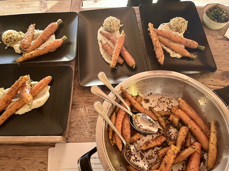 Das Lockstein 1, in dem der Kochworkshop stattfindet, ist nicht nur ein wunderschönes Hotel, es verfügt auch über einen eigenen großen Garten, in dem Christl und Gabi vieles von dem, was sie verkochen, selbst anbauen. So verkosten wir an drei verschiedenen Tagen vegetarisches Mett (sehr raffiniert), vegane Leberwurst, die aus Linsen erstellt wird, Gemüsehirse, Kümmelmöhren, Blumenkohlpüree und so vieles mehr – sogar Brennnesseln waren dabei.